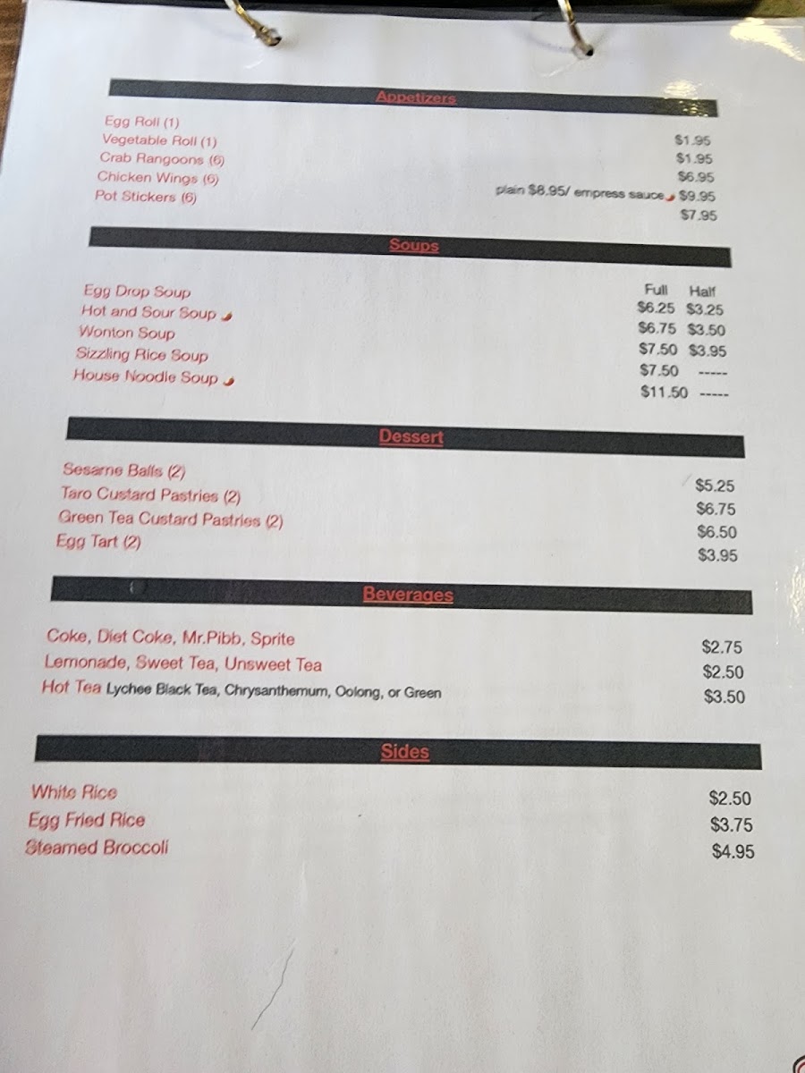 Appetizers include a selection of classic starters such as egg rolls, vegetable rolls, crab rangoons, chicken wings (including a version with Empress sauce), and pot stickers, which are pan-fried pork dumplings.